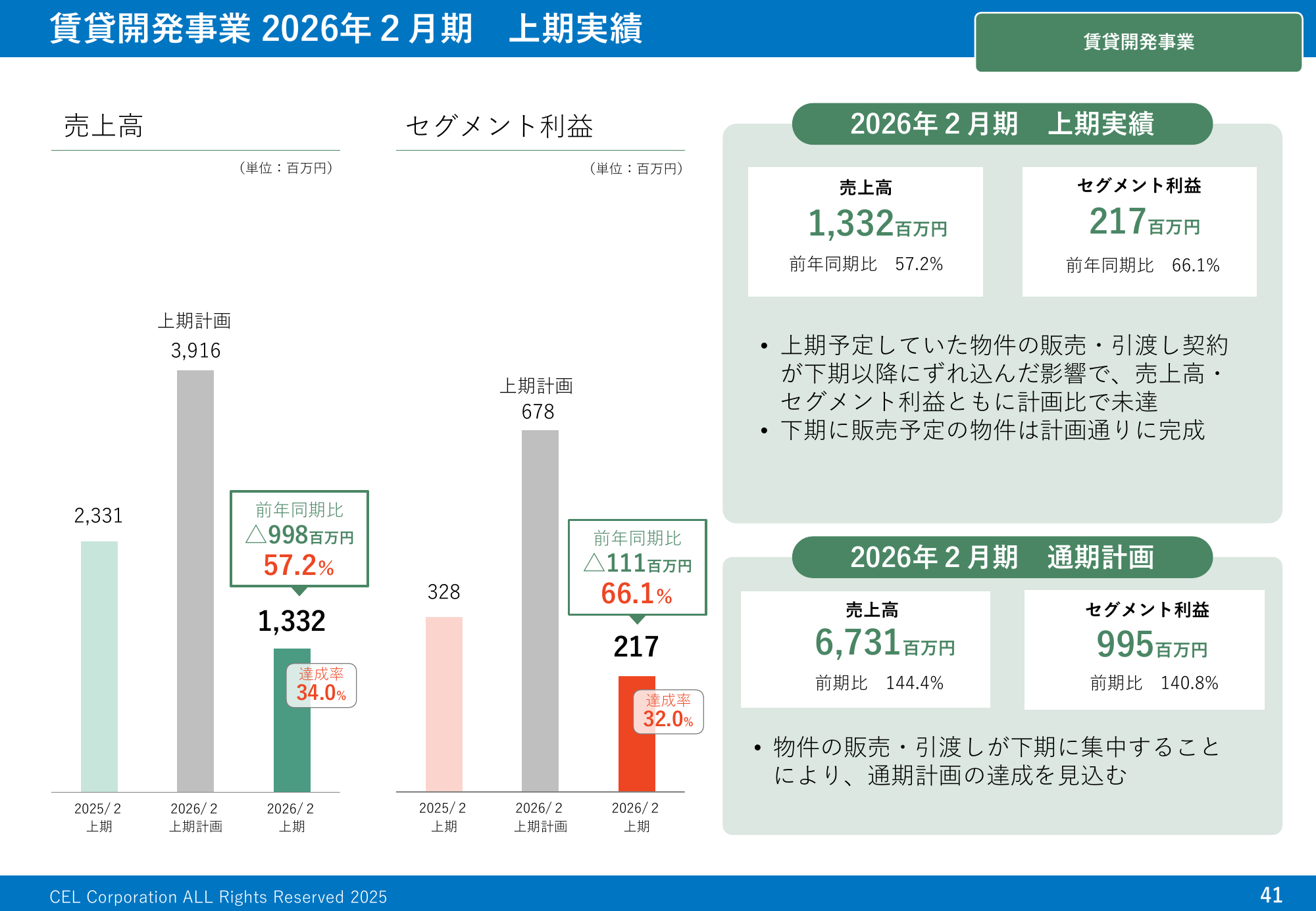 賃貸開発事業 2026年2月期 上期実績