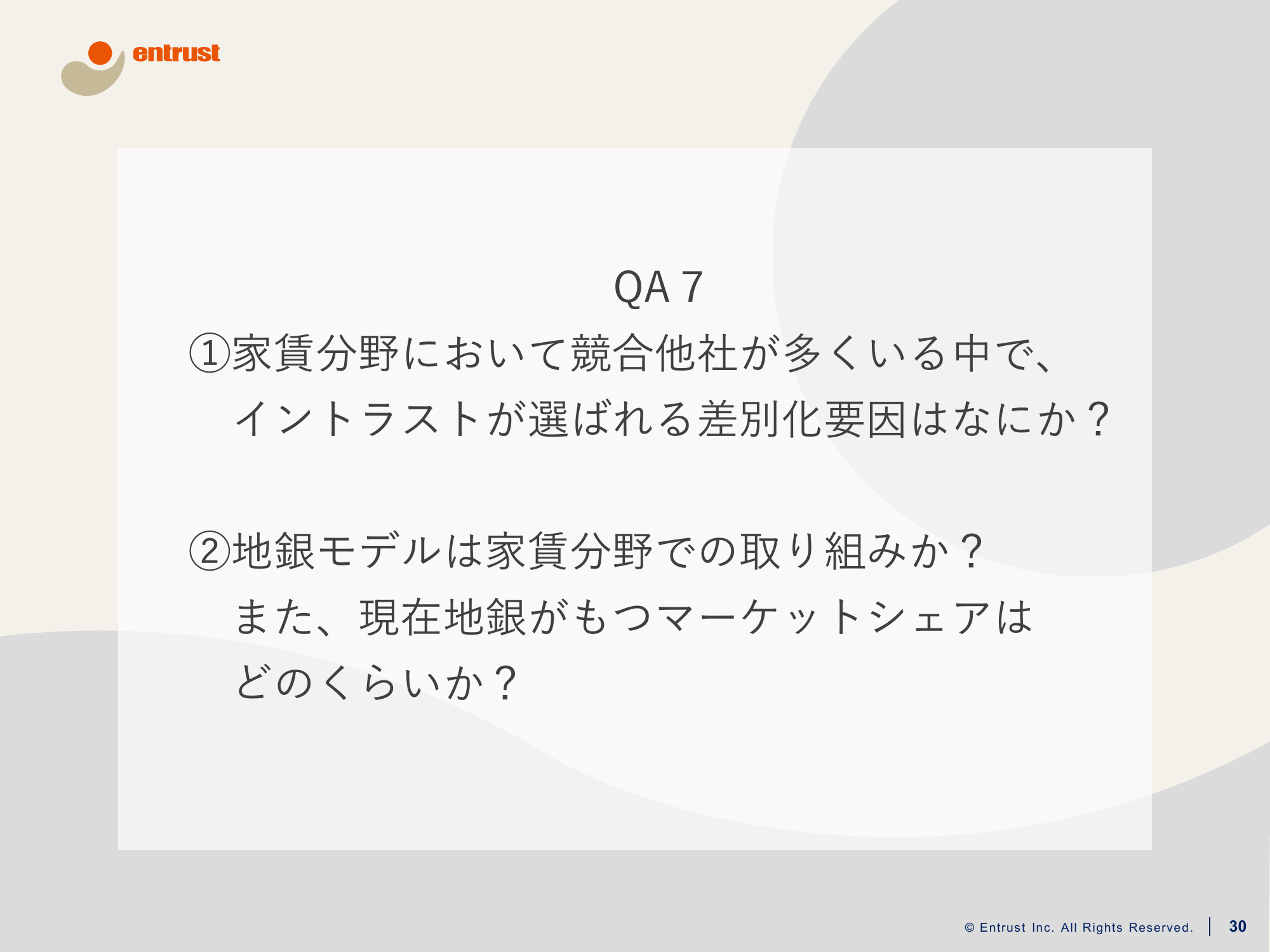 QA7.①家賃分野において競合他社が多くいる中で、イントラストが選ばれる差別化要因はなにか?②地銀モデルは家賃分野での取り組みか?また、現在地銀がもつマーケットシェアはどのくらいか?