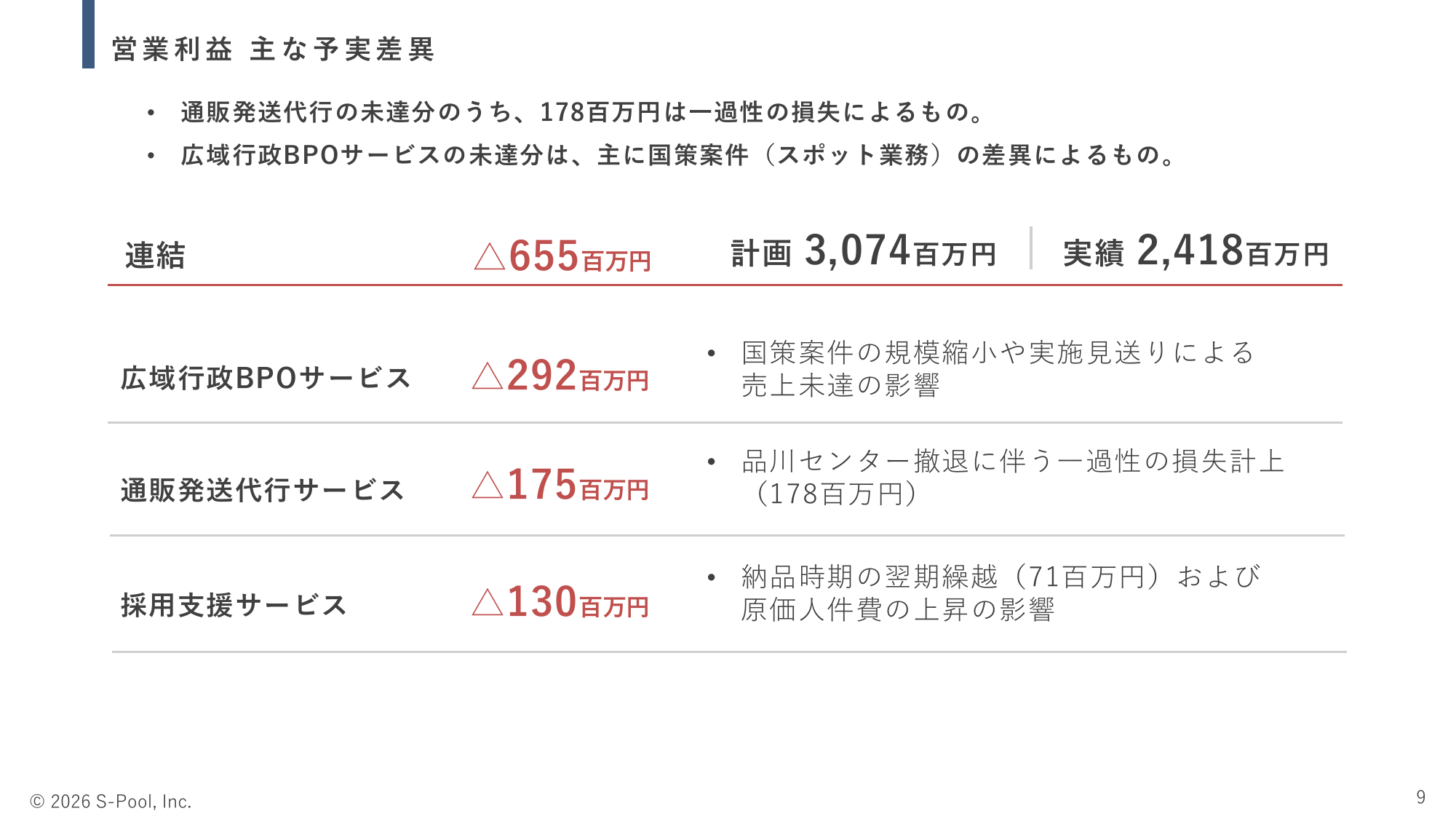 営業利益 主な予実差異