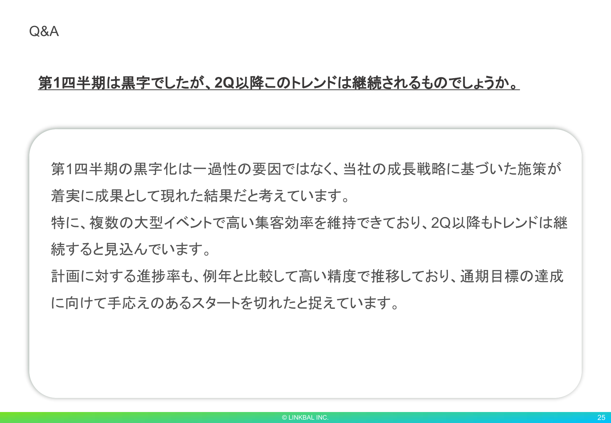 Q&A 第1四半期は黒字でしたが、2Q以降このトレンドは継続されるものでしょうか。