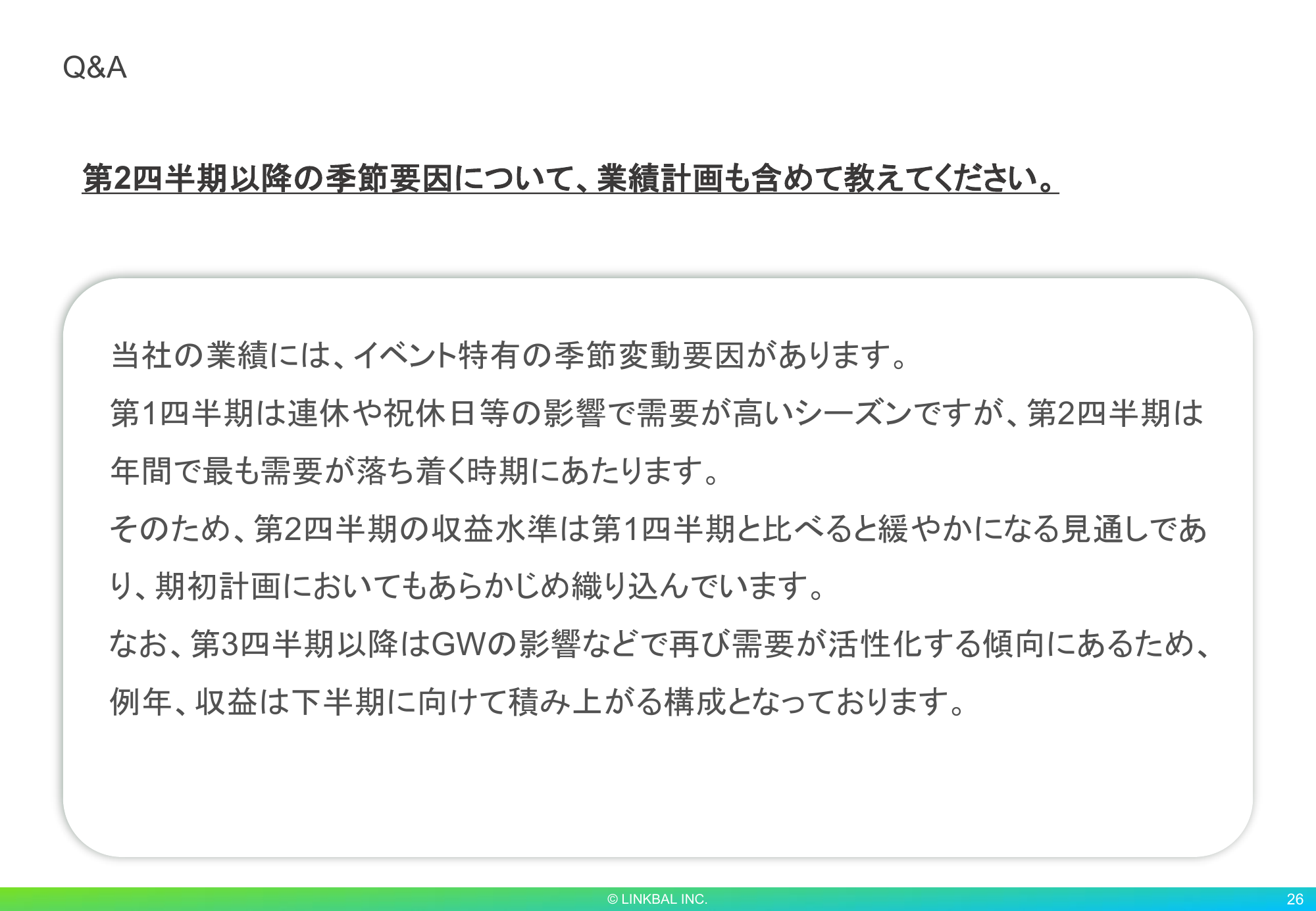 Q&A 第2四半期以降の季節要因について、業績計画も含めて教えてください 。