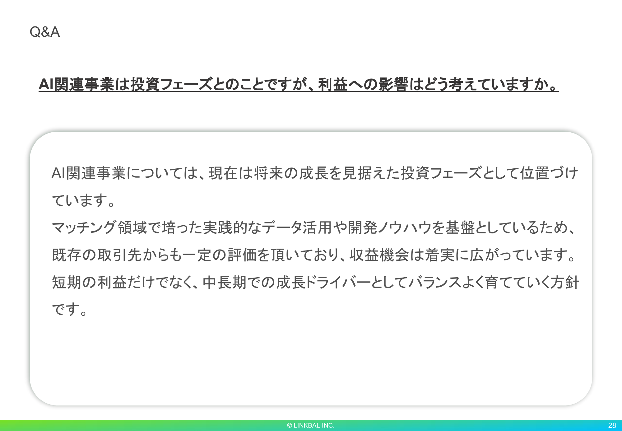 Q&A AI関連事業は投資フェーズとのことですが、利益への影響はどう考えていますか。