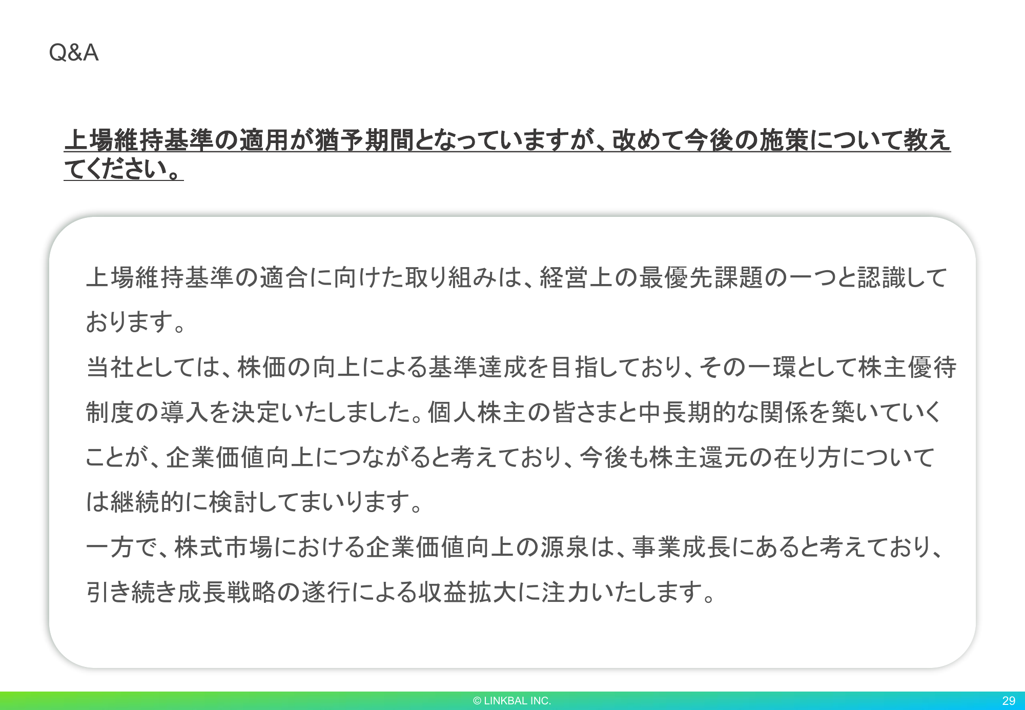 Q&A 上場維持基準の適用が猶予期間となっていますが、改めて今後の施策について教えてください。